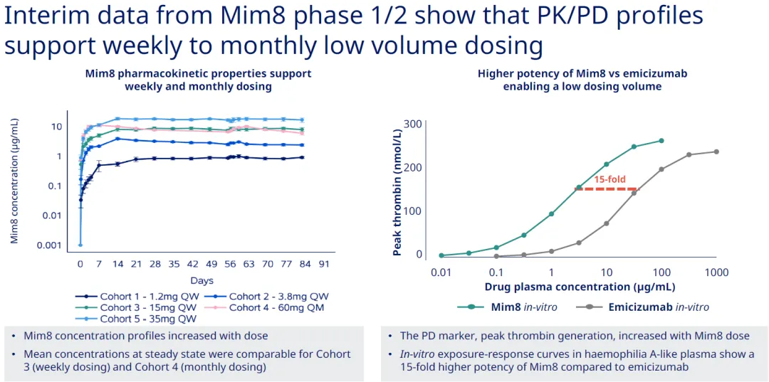 Mim8为一款FIX/FX双抗,相比罗氏的Emicizumab体外活性提高了15倍,PK/PD数据支持每周一次到每月一次给药。此前的2024年5月,诺和诺德宣布Mim8治疗血友病三期临床FRONTIER 2获得成功。